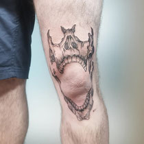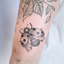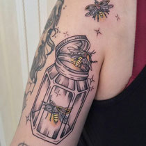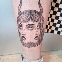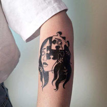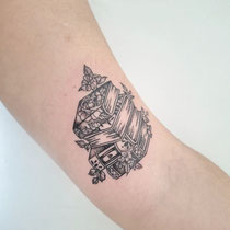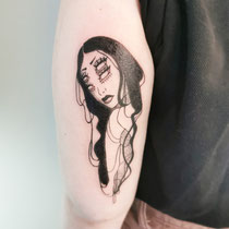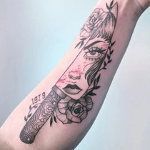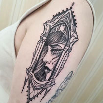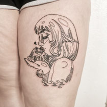 Son style, bien différent des autres tatoueuses du shop Méduse Tattoo, reprend un monde alternatif voir décalé qui donne envie de voyager dans son univers par le tracé de son aiguille.